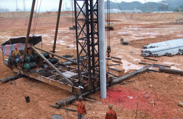 | 螺旋打桩机是一种通过动力头带动钻杆钻头向地下钻机成孔的打桩设备。螺旋打桩机可分为三个部分;桩架部分,桩锤部分和控制操作部分。桩锤依附在桩架前部两根平行的竖直导杆(俗称龙门)之间,用提升吊钩吊升。桩架为一钢结构塔架,在其后部设有卷扬机,用以起吊桩和桩锤。桩架前面有两根导杆组成的导向架,用以控制打桩方向,使桩按照设计方位准确地贯入地层。打桩工艺是:螺旋打桩机就位—埋设护筒—钻头轻触地面后旋转开钻—放下钻头—钻孔完成,清孔并测量深度—放入钢筋笼和导管—进行混凝土灌注—拔出护筒并清理桩头沉淤回填,成桩。 打桩机的基本技术参数是冲击部分重量、冲击动能和冲击频率,负载冲击性较大。 螺旋打桩机结构示意图