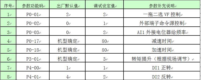 4、改造简单方便,无后顾之忧。只需要安装一个防水的电柜箱把变频放到里面接正反转端子到操控室加个3档的开关就可以了。如变频出现问题只需要把电机线接到启动器上就可以用改装之前的设备了。 变频器参数设置如下: 变频器参数设置表 应用图纸如下: 变频器电控图纸