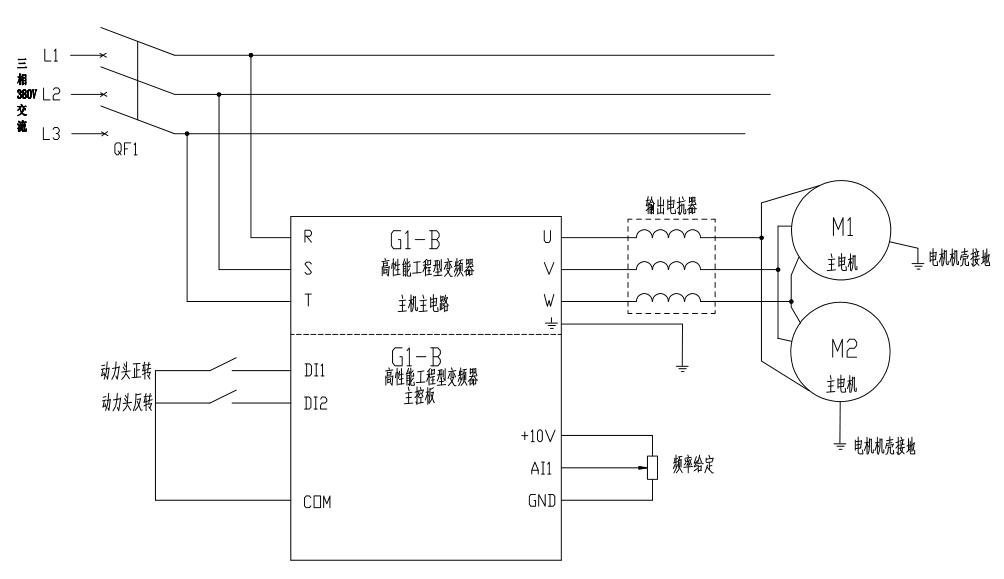 注:由于变频器使用在螺旋打桩机上需拖带两台以上电机,一般需在变频器输出端加装输出电抗器。 英飞克G1-B系列变频器已经在打桩机成功应用,G1-B变频器运行稳定, 变频器以一拖二的方式驱动两台电机同向旋转形成力矩带动钻杆,利用变频器的模拟量外接电位器调速以对应不同的速度要求,控制精度等技术性能均能满足实际要求,并且能够具备调速精度高、稳定性好、操作简洁及功能齐全的特点,而且成本低,使用简单方便,生产效率大大提高,且故障率低,维护方便,减少机器的磨损,延长其使用寿命 |